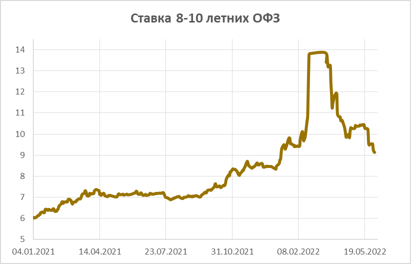 Как мы уже неоднократно писали в прежних статьях по ОГК-2, размер чистой прибыли значительно зависит от размера оплаты мощности, модернизированной по программе ДПМ. Важным фактором в размере оплаты мощности по ДПМ является привязка его к ставке доходности 8-10 летних ОФЗ, которая применяется с лагом в год. А график доходности ОФЗ выглядит сейчас вот так: