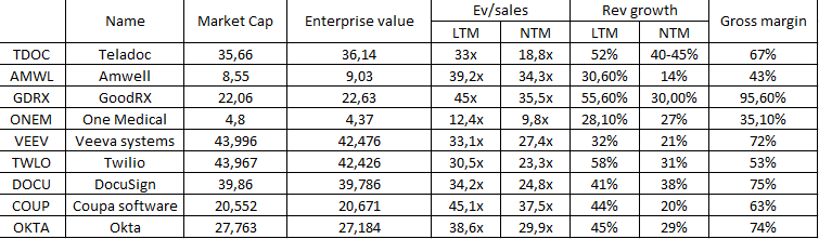 Для сравнения Teladoc в настоящее время торгуется с почти 50% дисконтом к прогнозам на следующий год по сравнению со своим ближайшим конкурентом Amwell, у которого gross margin сильно меньше. Видно, что GoodRx, например, справедливо стоит дороже, учитывая его лучшую валовую маржу и прибыльность. Также, думаю, мы можем сравнивать Teladoc с SaaS компаниями, и мы видим, что оценка существенно ниже: